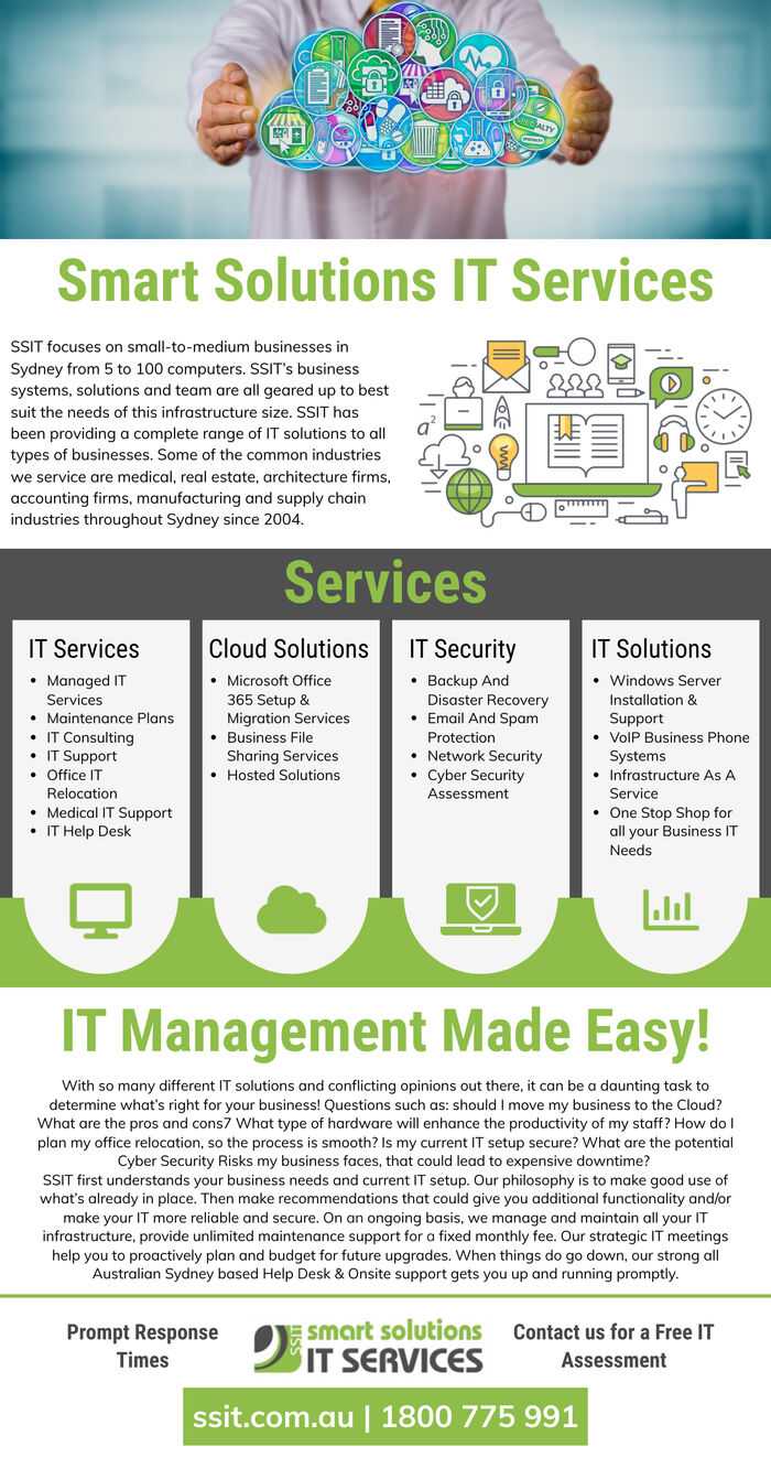 SSIT focuses on small-to-medium businesses in Sydney from 5 to 100 computers. SSIT’s business systems, solutions and team are all geared up to best suit the needs of this infrastructure size. SSIT has been providing a complete range of IT solutions to all types of business. Some of the common industries we service are medical, real estate, architecture firms, accounting firms, manufacturing and supply chain industries throughout Sydney since 2004.