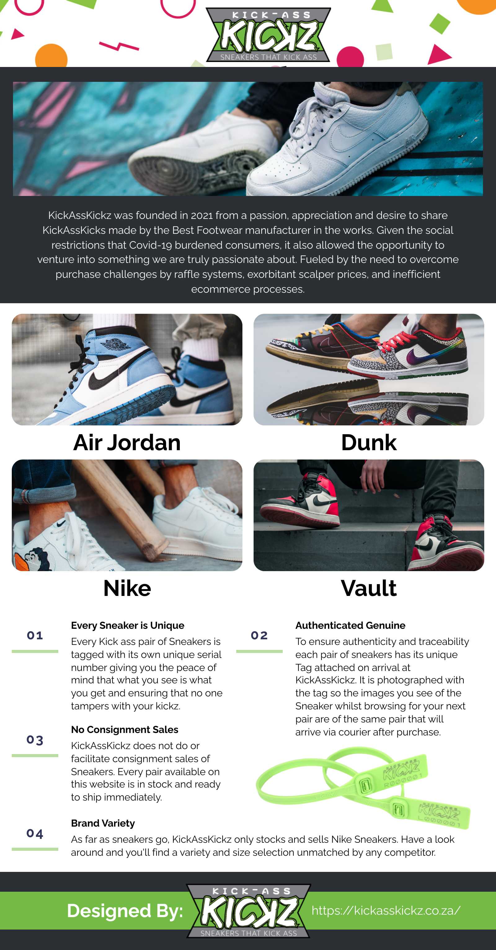 KickAssKickz is an authentic footwear company with exclusive, high end and fashionable kickz for every day wear. It was founded in 2021 from a passion, appreciation and desire to share KickAssKickz, made by the Best Footwear manufacturer in the works. Fueled by the need to overcome purchase challenges by raffle systems, exorbitant scalper prices, and inefficient ecommerce processes, our kickz are affordable, 100% original and you have a variety to choose from. Our shoes are manufactured using only the best materials and constructed by expert craftsmen.