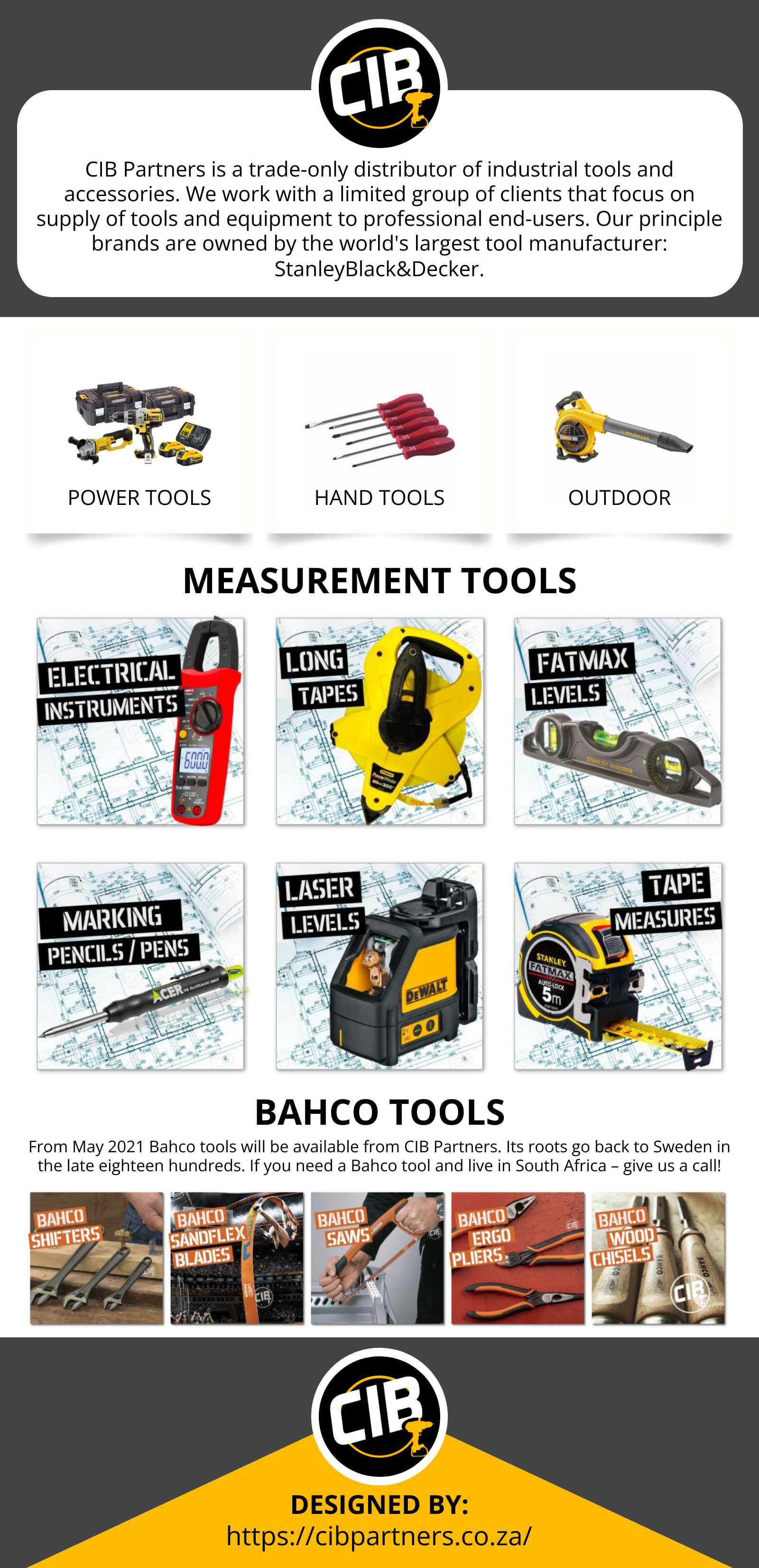 CIB Partners is a distributor of industrial tools and accessories. We focus on supply of tools and equipment to professional end-users. Our principle brands are owned by the world's largest tool manufacturer: StanleyBlackDecker.