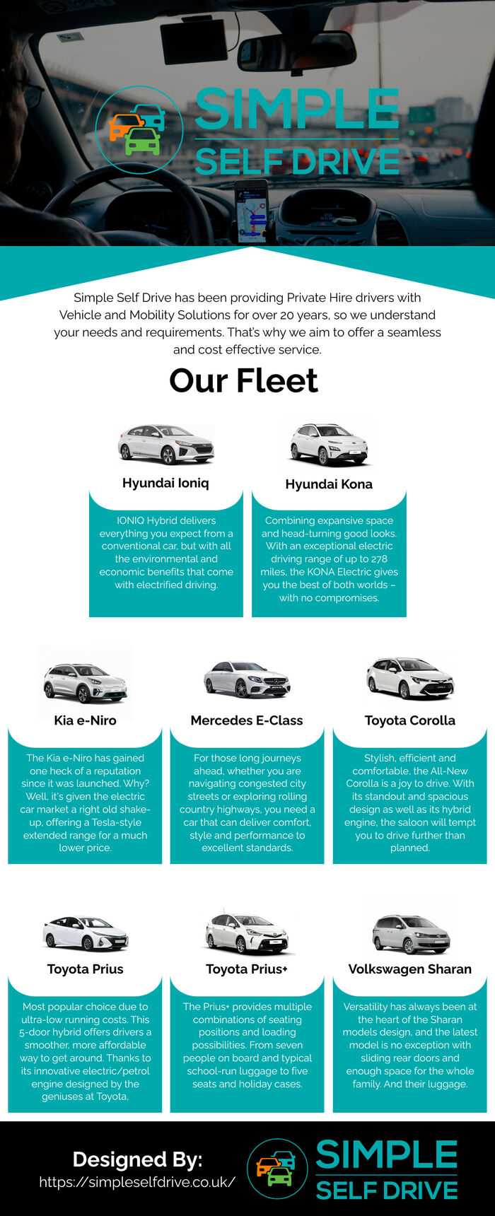 Simple Self Drive is one of London's leading PCO self drive hire companies. With over 20 years experience we specialise in providing London Private Hire drivers with a range of vehicles to hire including Fully EV vehicles, Executive and 7 seaters. Our cars are fully licensed to give the clients peace of mind.