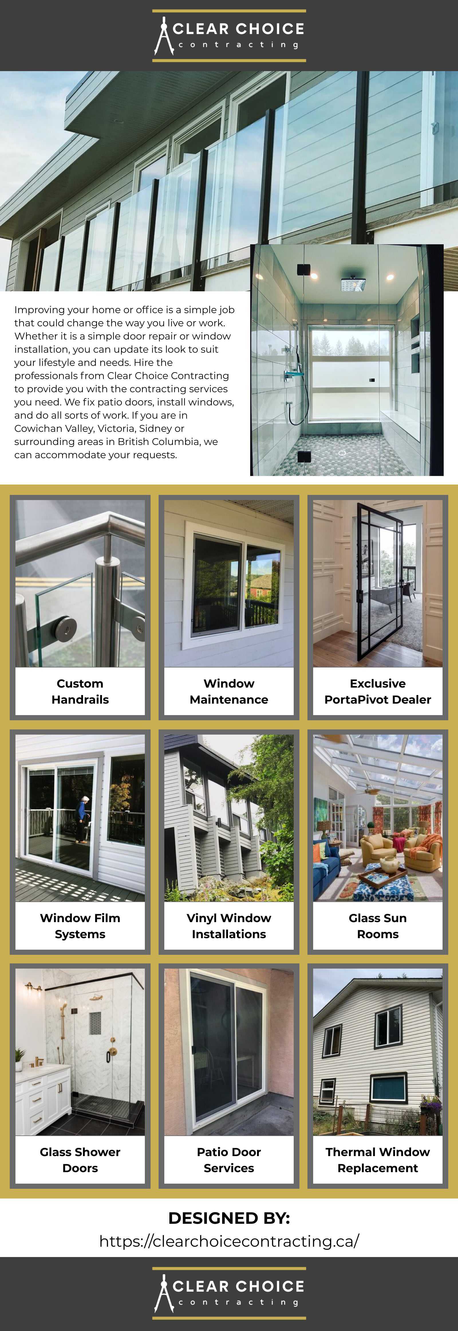 Updating your home or office with the modern look of glass could change the way you live or work. Whether it is an amazing pivot door or glass partitions for the new normal in office working, you can update its look to suit your lifestyle and needs. Hire the professionals from Clear Choice Contracting to provide you with the glass and window contracting services you need. We repair glass patio doors, install vinyl windows, and add glass shower doors to your current bathroom. If you are in Cowichan Valley, Duncan, Victoria or Sidney and surrounding areas in British Columbia, we would like to hear about your project ideas. Please contact us today for more information.