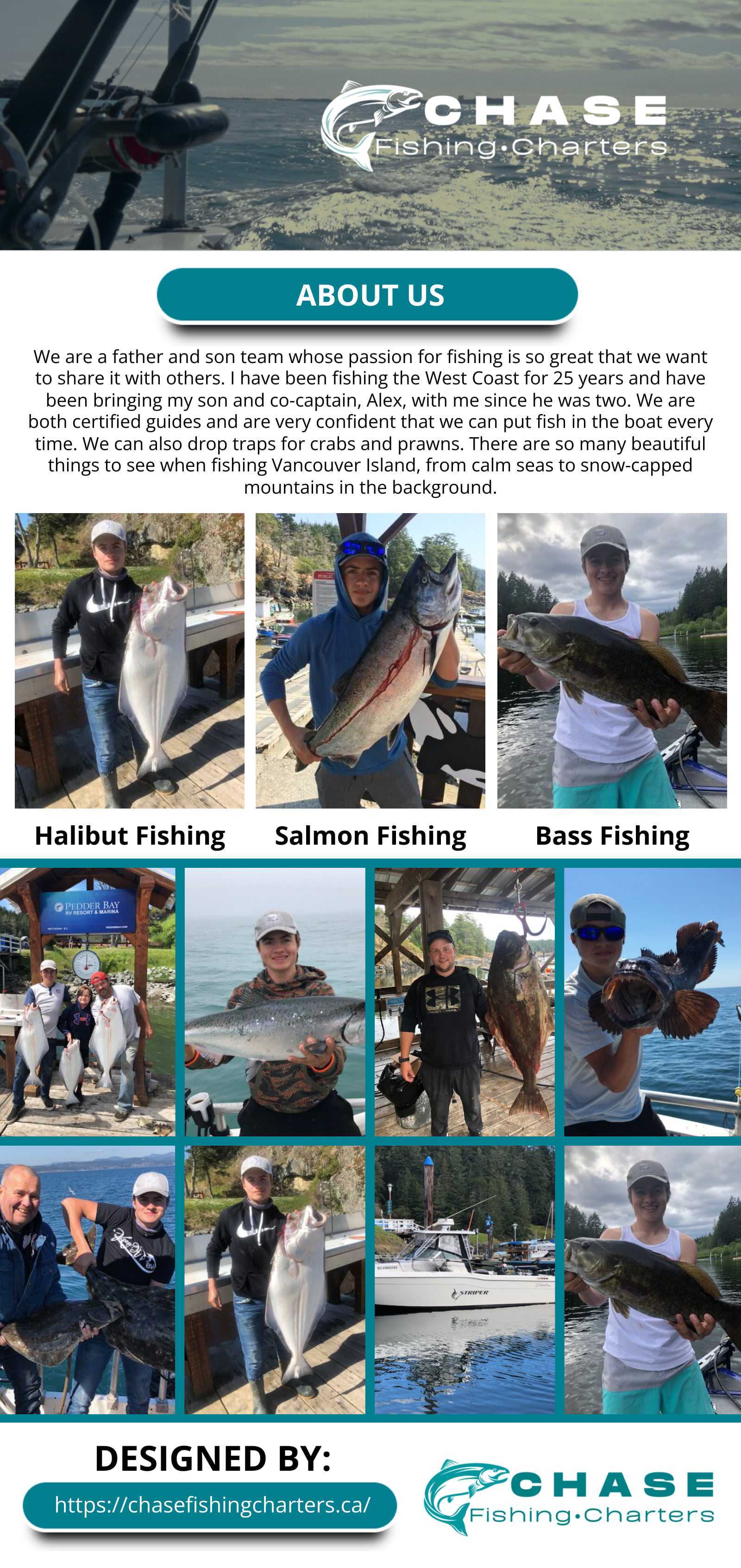 We are a father and son team whose passion for fishing is so great that we want to share it with others. I have been fishing the West Coast for 25 years and have been bringing my son and co-captain, Alex, with me since he was two. We are both certified guides and are very confident that we can put fish in the boat every time. We can also drop traps for crabs and prawns. There are so many beautiful things to see when fishing Vancouver Island, from calm seas to snow-capped mountains in the background. Whales, porpoises, seals and sea lions are also quite common. A day’s fishing with us, either Victoria or Bamfield will be a memorable one and a definite' to-do' when visiting Victoria.