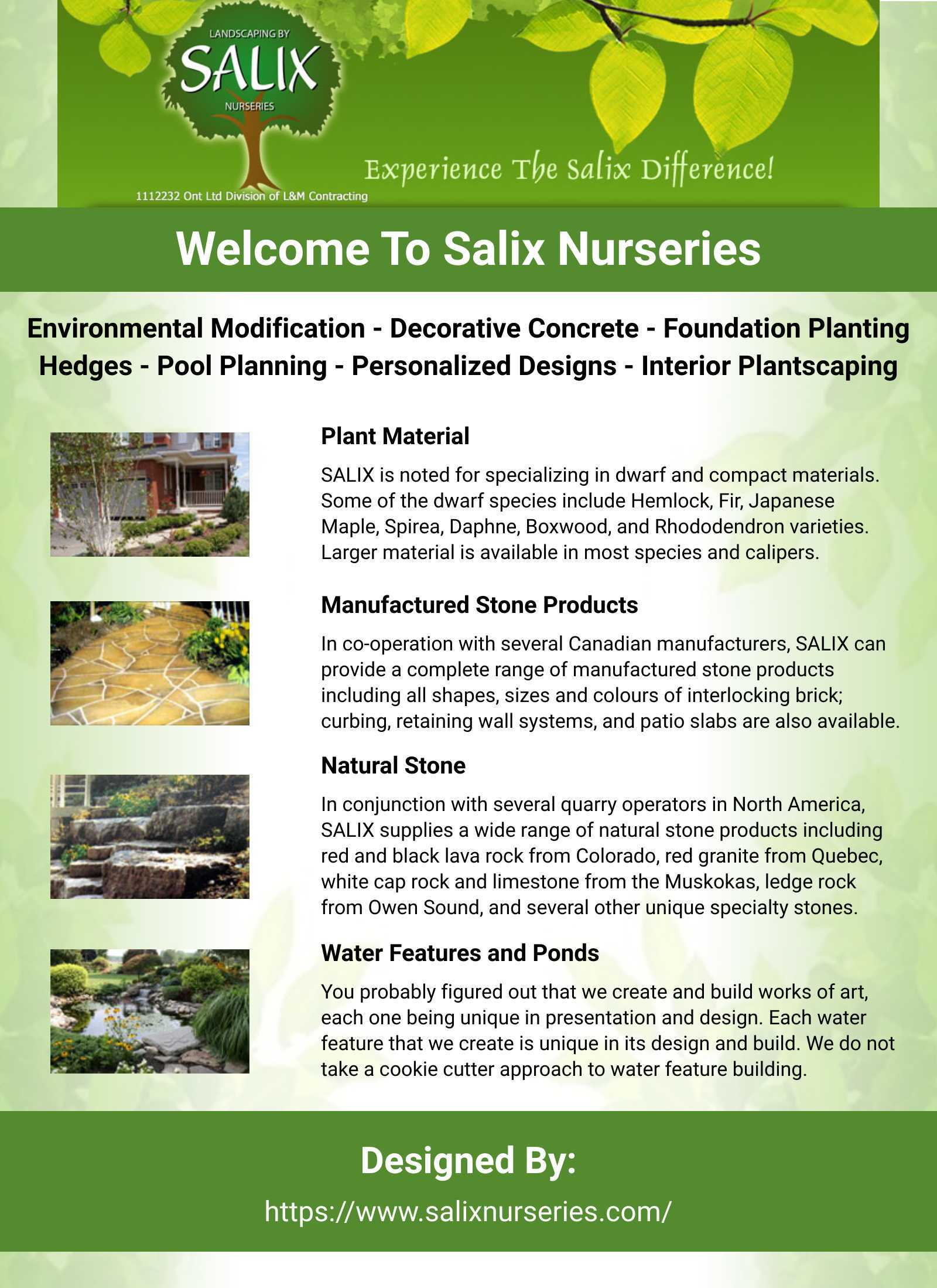 SALIX has been active in the landscaping industry for over 30 years. We are a highly mechanized company capable of ten-day turnaround, even during peak season. Home2 SALIX has served the landscaping needs of hundreds of commercial, industrial and residential owners throughout Ontario. Located 30 miles north-east of Toronto, SALIX has wide-ranging capabilities including soil supply, custom soil mixing, plant material supply, excavating, on-site contouring, and all other aspects of landscape construction. We design to your individual needs to beautify and enhance your property, and increase your property value.