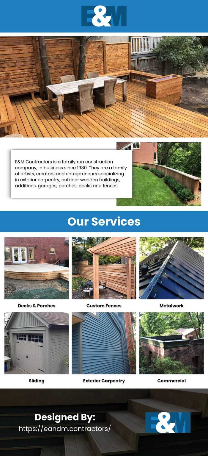 EM Contractors is a family run construction company, in business since 1980. They are a family of artists, creators and entrepreneurs specializing in exterior carpentry, outdoor wooden buildings, additions, garages, porches, decks and fences.