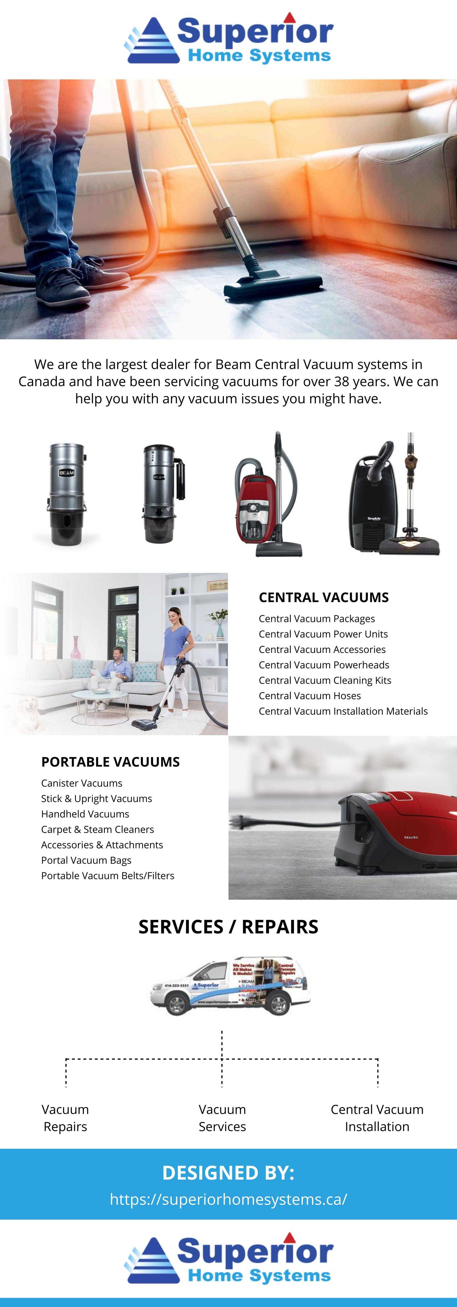 Superior Home Systems is the largest dealer for Beam Central Vacuum systems in Canada and have been servicing vacuums for over 38 years. We can help you with any vacuum issues you might have. Call us and with our same day service, you can't go wrong. Helping create healthier cleaner homes with the highest quality vacuum systems that exceed the needs of our clients.